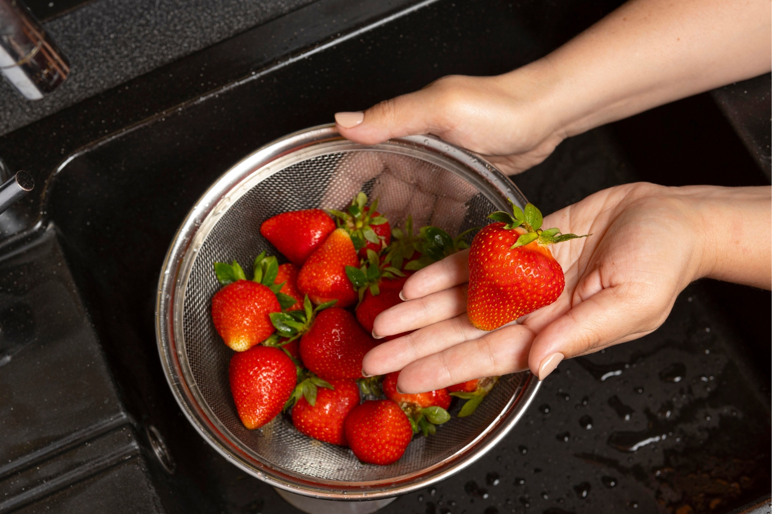 イチゴはデリケートな果物なので、食べる直前にやさしく洗いましょう。ヘタを付けたまま水を張ったボールに入れて優しくかき回す程度でOK。洗い終わったらキッチンペーパーで優しく水気を取ってください。濡れたままだと水っぽくなり、味がぼけてしまいます。