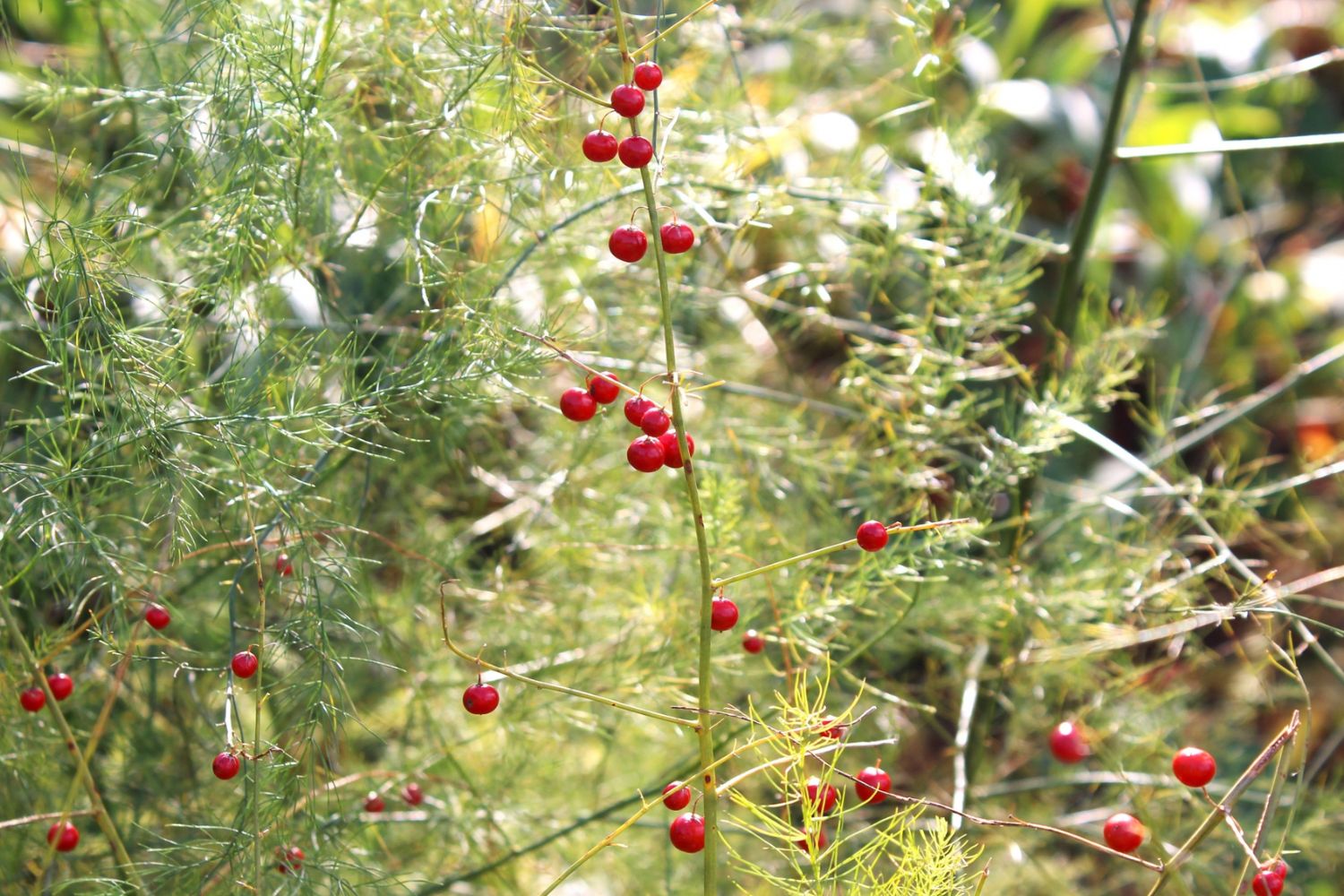 ちなみに、下の写真はアスパラガスの実です。メスの株には花が咲いた後、このような赤い小さな実をつけます。季節外れのクリスマスツリーみたいで可愛いですよね。